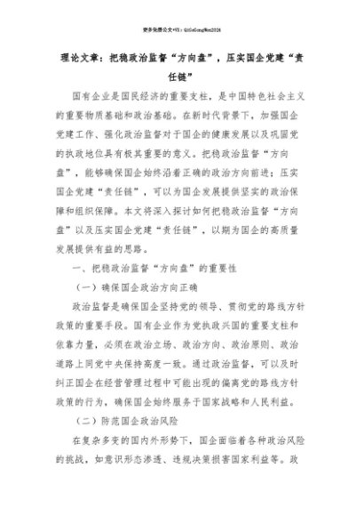 【七哥公文】2025年:【七哥公文】理论文章:把稳政治监督“方向盘”,压实国企党建“责任链”+更多免费公文+VX:QiGeGongWen2024+更多免费公文+VX:QiGeGongWen2024