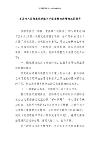 【七哥公文】2025年:【七哥公文】某某市人民检察院党组关于巡察整改进展情况的报告+更多免费公文+VX:QiGeGongWen2024+更多免费公文+VX:QiGeGongWen2024