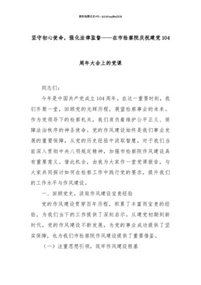【七哥公文】2025年:【七哥公文】坚守初心使命,强化法律监督——在市检察院庆祝建党104周年大会上的党课+更多免费公文+VX:QiGeGongWen2024+更多免费公文+VX:QiGeGongWen2024