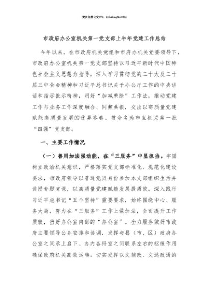 【七哥公文】2025年:【七哥公文】市政府办公室机关第一党支部上半年党建工作总结+更多免费公文+VX:QiGeGongWen2024+更多免费公文+VX:QiGeGongWen2024