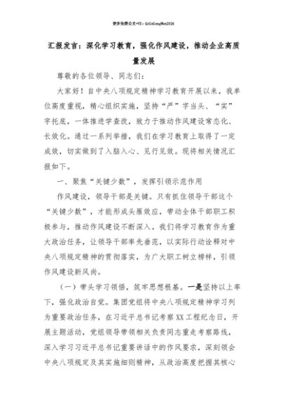 【七哥公文】2025年:【七哥公文】汇报发言:深化学习教育,强化作风建设,推动企业高质量发展+更多免费公文+VX:QiGeGongWen2024+更多免费公文+VX:QiGeGongWen2024