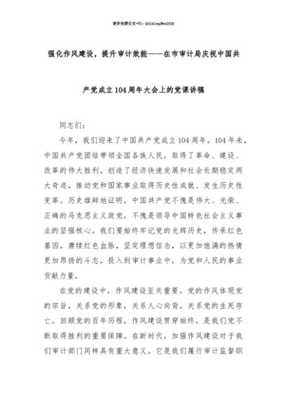 【七哥公文】2025年:【七哥公文】强化作风建设,提升审计效能——在市审计局庆祝中国共产党成立104周年大会上的党课讲稿+更多免费公文+VX:QiGeGongWen2024+更多免费公文+VX:QiGeGongWen2024