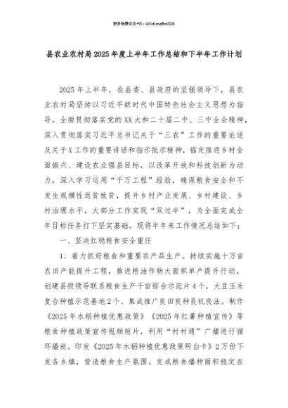 【七哥公文】2025年:【七哥公文】县农业农村局2025年度上半年工作总结和下半年工作计划+更多免费公文+VX:QiGeGongWen2024+更多免费公文+VX:QiGeGongWen2024