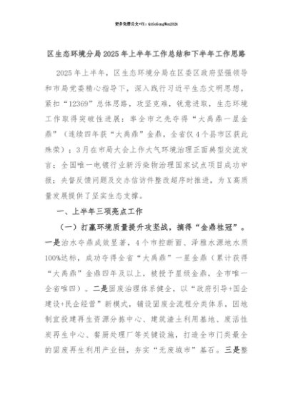【七哥公文】2025年:【七哥公文】区生态环境分局2025年上半年工作总结和下半年工作思路+更多免费公文+VX:QiGeGongWen2024+更多免费公文+VX:QiGeGongWen2024