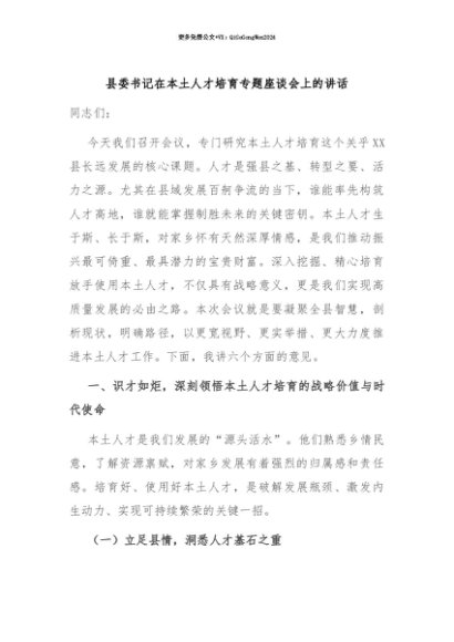 【七哥公文】2025年:【七哥公文】县委书记在本土人才培育专题座谈会上的讲话+更多免费公文+VX:QiGeGongWen2024+更多免费公文+VX:QiGeGongWen2024