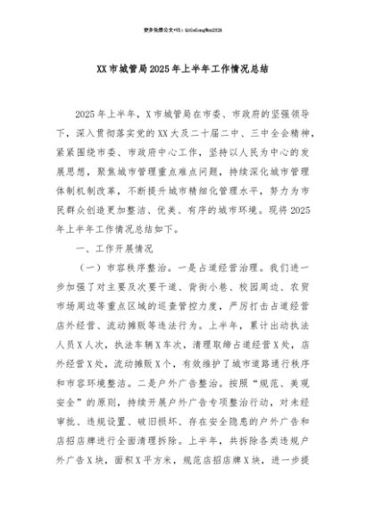 【七哥公文】2025年:【七哥公文】XX市城管局2025年上半年工作情况总结+更多免费公文+VX:QiGeGongWen2024+更多免费公文+VX:QiGeGongWen2024