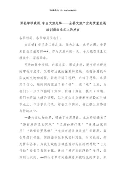 【七哥公文】2025年:【七哥公文】深化学以致用,争当文旅先锋——全县文旅产业高质量发展培训班结业式上的发言+更多免费公文+VX:QiGeGongWen2024+更多免费公文+VX:QiGeGongWen2024
