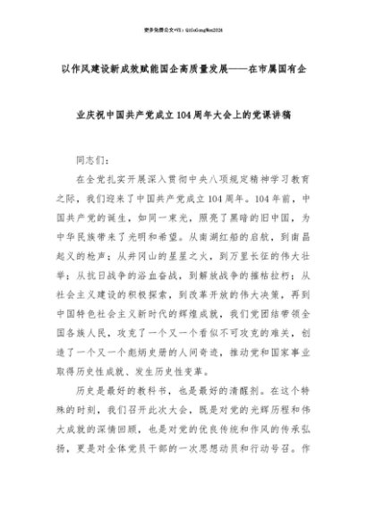 【七哥公文】2025年:【七哥公文】以作风建设新成效赋能国企高质量发展——在市属国有企业庆祝中国共产党成立104周年大会上的党课讲稿+更多免费公文+VX:QiGeGongWen2024+更多免费公文+VX:QiGeGongWen2024