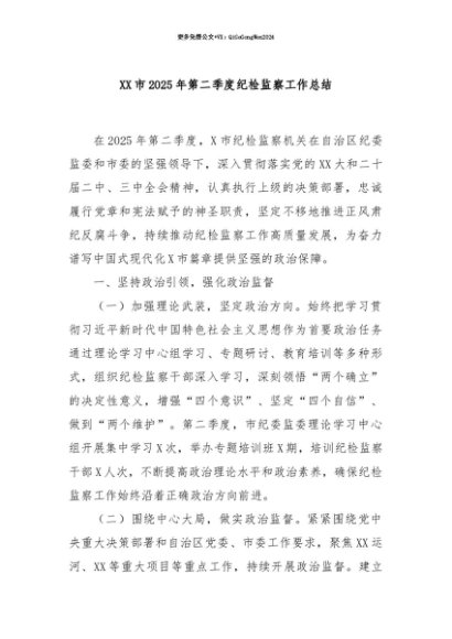 【七哥公文】2025年:【七哥公文】XX市2025年第二季度纪检监察工作总结+更多免费公文+VX:QiGeGongWen2024+更多免费公文+VX:QiGeGongWen2024