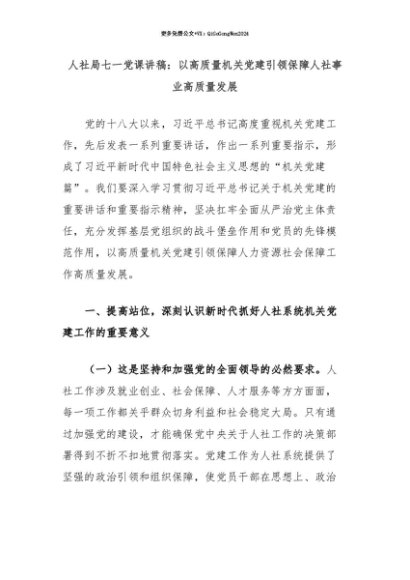 【七哥公文】2025年:【七哥公文】人社局七一党课讲稿:以高质量机关党建引领保障人社事业高质量发展+更多免费公文+VX:QiGeGongWen2024+更多免费公文+VX:QiGeGongWen2024