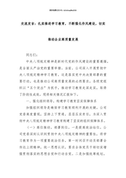 【七哥公文】2025年:【七哥公文】交流发言:扎实推进学习教育,不断强化作风建设,切实推动企业高质量发展+更多免费公文+VX:QiGeGongWen2024+更多免费公文+VX:QiGeGongWen2024