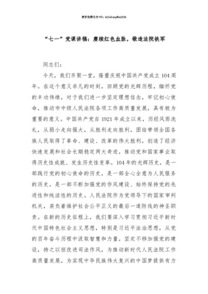 【七哥公文】2025年:【七哥公文】“七一”党课讲稿:赓续红色血脉,锻造法院铁军+更多免费公文+VX:QiGeGongWen2024+更多免费公文+VX:QiGeGongWen2024