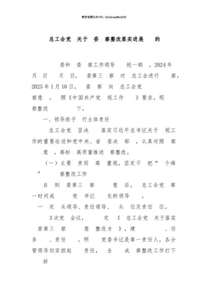 【七哥公文】2025年:【七哥公文】XX市总工会党组关于市委巡察整改落实进展情况的报告+更多免费公文+VX:QiGeGongWen2024+更多免费公文+VX:QiGeGongWen2024