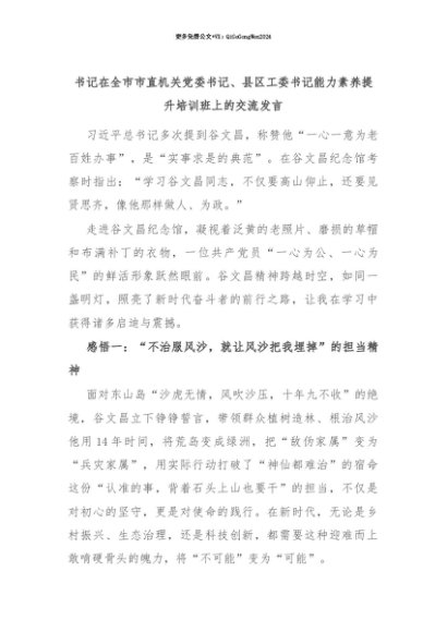 【七哥公文】2025年:【七哥公文】书记在全市市直机关党委书记、县区工委书记能力素养提升培训班上的交流发言+更多免费公文+VX:QiGeGongWen2024+更多免费公文+VX:QiGeGongWen2024