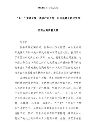 【七哥公文】2025年:【七哥公文】“七一”党课讲稿:赓续红色血脉,以作风建设新成效推动国企高质量发展+更多免费公文+VX:QiGeGongWen2024+更多免费公文+VX:QiGeGongWen2024