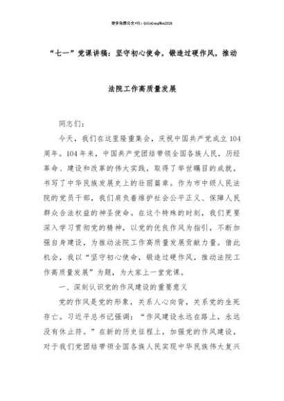 【七哥公文】2025年:【七哥公文】“七一”党课讲稿:坚守初心使命,锻造过硬作风,推动法院工作高质量发展+更多免费公文+VX:QiGeGongWen2024+更多免费公文+VX:QiGeGongWen2024
