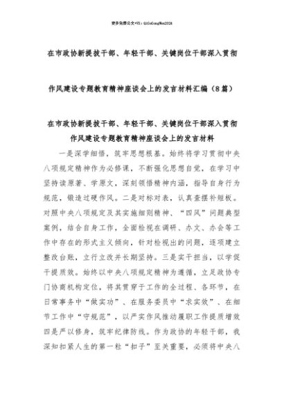【七哥公文】2025年:【七哥公文】(8篇)在市政协新提拔干部、年轻干部、关键岗位干部深入贯彻作风建设专题教育精神座谈会上的发言材料汇编+更多免费公文+VX:QiGeGongWen2024+更多免费公文+VX:QiGeGongWen2024