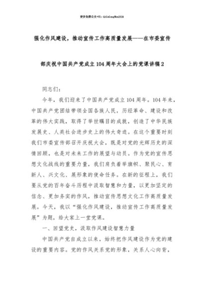 【七哥公文】2025年:【七哥公文】强化作风建设,推动宣传工作高质量发展——在市委宣传部庆祝中国共产党成立104周年大会上的党课讲稿2+更多免费公文+VX:QiGeGongWen2024+更多免费公文+VX:QiGeGongWen2024