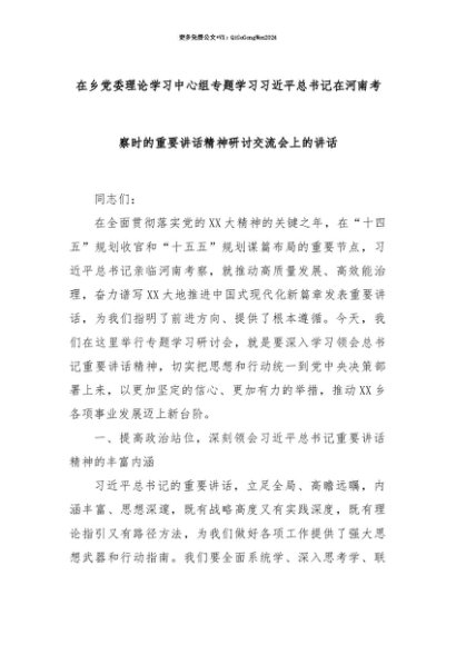【七哥公文】2025年:【七哥公文】在乡党委理论学习中心组专题学习习近平总书记在河南考察时的重要讲话精神研讨交流会上的讲话+更多免费公文+VX:QiGeGongWen2024+更多免费公文+VX:QiGeGongWen2024