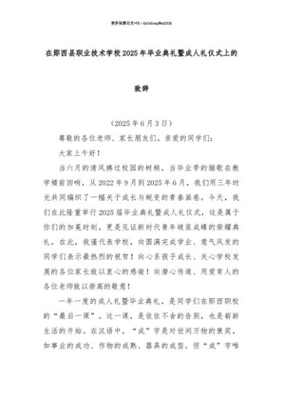 【七哥公文】2025年:【七哥公文】在郧西县职业技术学校2025年毕业典礼暨成人礼仪式上的致辞+更多免费公文+VX:QiGeGongWen2024+更多免费公文+VX:QiGeGongWen2024