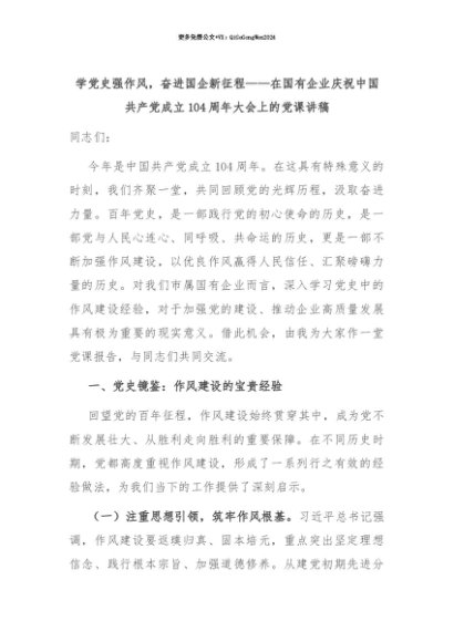 【七哥公文】2025年:【七哥公文】学党史强作风,奋进国企新征程——在国有企业庆祝中国共产党成立104周年大会上的党课讲稿+更多免费公文+VX:QiGeGongWen2024+更多免费公文+VX:QiGeGongWen2024