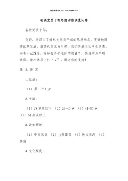 【七哥公文】2025年:【七哥公文】机关党员干部思想动态调查问卷+更多免费公文+VX:QiGeGongWen2024+更多免费公文+VX:QiGeGongWen2024