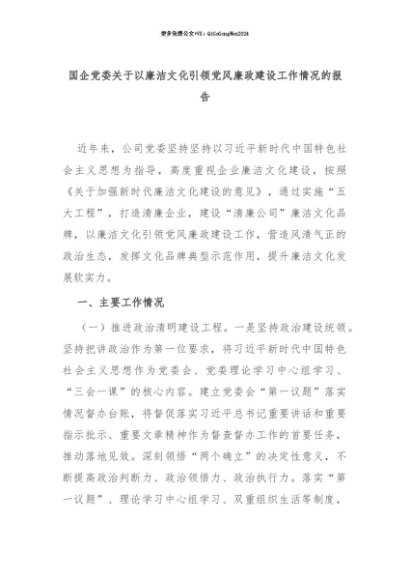 【七哥公文】2025年:【七哥公文】国企党委关于以廉洁文化引领党风廉政建设工作情况的报告+更多免费公文+VX:QiGeGongWen2024+更多免费公文+VX:QiGeGongWen2024