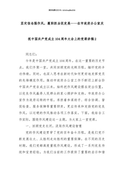 【七哥公文】2025年:【七哥公文】坚定信念强作风,履职担当促发展——在市政府办公室庆祝中国共产党成立104周年大会上的党课讲稿2+更多免费公文+VX:QiGeGongWen2024+更多免费公文+VX:QiGeGongWen2024