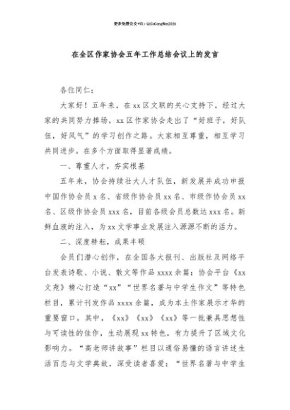 【七哥公文】2025年:【七哥公文】在全区作家协会五年工作总结会议上的发言+更多免费公文+VX:QiGeGongWen2024+更多免费公文+VX:QiGeGongWen2024