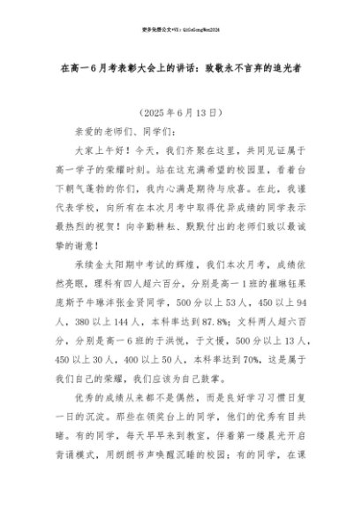 【七哥公文】2025年:【七哥公文】在高一6月考表彰大会上的讲话:致敬永不言弃的追光者+更多免费公文+VX:QiGeGongWen2024+更多免费公文+VX:QiGeGongWen2024