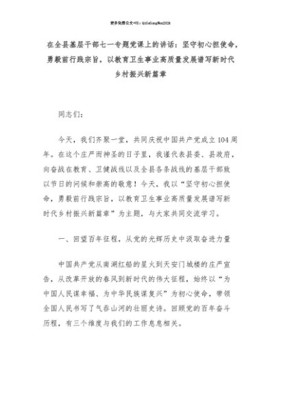 【七哥公文】2025年:【七哥公文】在全县基层干部七一专题党课上的讲话:坚守初心担使命,勇毅前行践宗旨,以教育卫生事业高质量发展谱写新时代乡村振兴新篇章+更多免费公文+VX:QiGeGongWen2024+更多免费公文+VX:QiGeGongWen2024