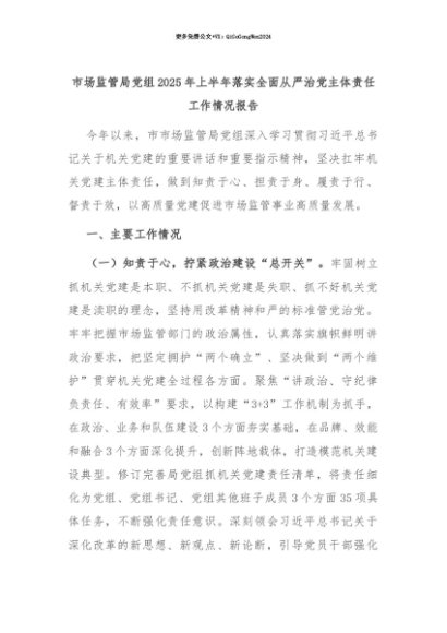 【七哥公文】2025年:【七哥公文】市场监管局党组2025年上半年落实全面从严治党主体责任工作情况报告+更多免费公文+VX:QiGeGongWen2024+更多免费公文+VX:QiGeGongWen2024