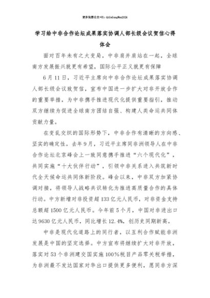 【七哥公文】2025年:【七哥公文】学习给中非合作论坛成果落实协调人部长级会议贺信心得体会+更多免费公文+VX:QiGeGongWen2024+更多免费公文+VX:QiGeGongWen2024