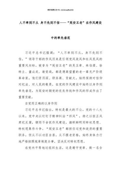 【七哥公文】2025年:【七哥公文】人不率则不从 身不先则不信——“延安五老”在作风建设中的率先垂范+更多免费公文+VX:QiGeGongWen2024+更多免费公文+VX:QiGeGongWen2024