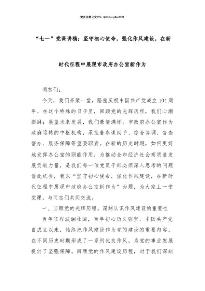 【七哥公文】2025年:【七哥公文】“七一”党课讲稿:坚守初心使命,强化作风建设,在新时代征程中展现市政府办公室新作为+更多免费公文+VX:QiGeGongWen2024+更多免费公文+VX:QiGeGongWen2024