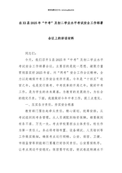 【七哥公文】2025年:【七哥公文】在XX县2025年“中考”及初二学业水平考试安全工作部署会议上的讲话材料+更多免费公文+VX:QiGeGongWen2024+更多免费公文+VX:QiGeGongWen2024