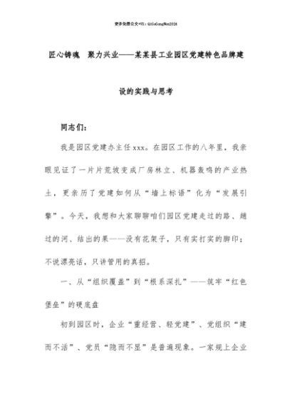【七哥公文】2025年:【七哥公文】匠心铸魂 聚力兴业——某某县工业园区党建特色品牌建设的实践与思考+更多免费公文+VX:QiGeGongWen2024+更多免费公文+VX:QiGeGongWen2024
