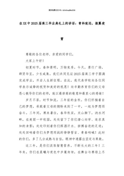 【七哥公文】2025年:【七哥公文】在XX中2025届高三毕业典礼上的讲话:青衿致远,振翼凌霄+更多免费公文+VX:QiGeGongWen2024+更多免费公文+VX:QiGeGongWen2024