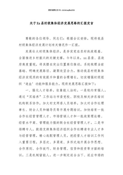 【七哥公文】2025年:【七哥公文】关于Xx县村级集体经济发展思路的汇报发言+更多免费公文+VX:QiGeGongWen2024+更多免费公文+VX:QiGeGongWen2024