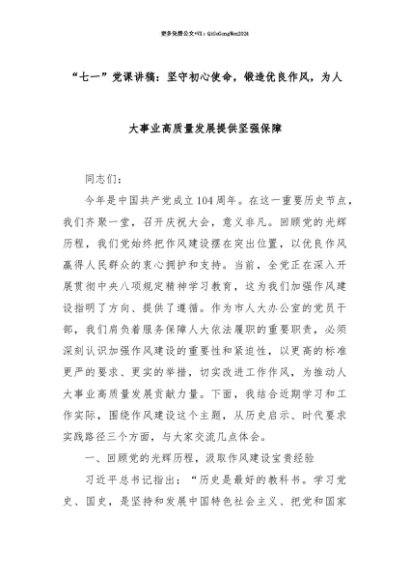 【七哥公文】2025年:【七哥公文】“七一”党课讲稿:坚守初心使命,锻造优良作风,为人大事业高质量发展提供坚强保障+更多免费公文+VX:QiGeGongWen2024+更多免费公文+VX:QiGeGongWen2024