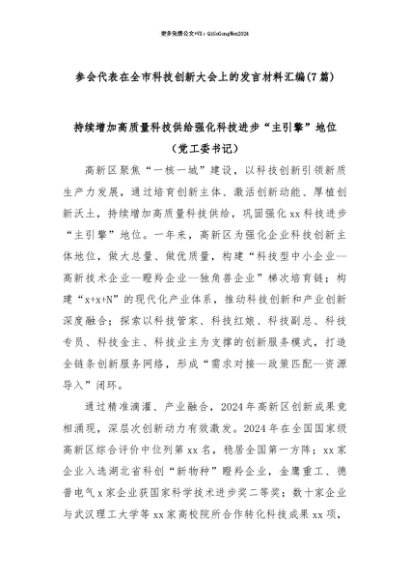 【七哥公文】2025年:【七哥公文】(7篇)参会代表在全市科技创新大会上的发言材料汇编+更多免费公文+VX:QiGeGongWen2024+更多免费公文+VX:QiGeGongWen2024