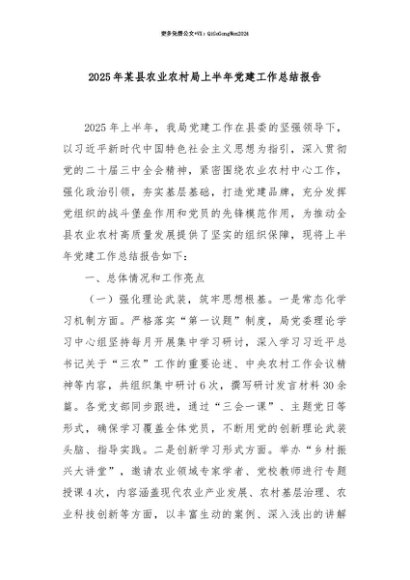 【七哥公文】2025年:【七哥公文】2025年某县农业农村局上半年党建工作总结报告+更多免费公文+VX:QiGeGongWen2024+更多免费公文+VX:QiGeGongWen2024
