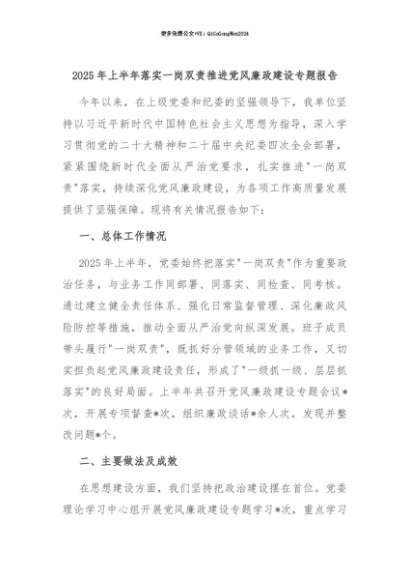 【七哥公文】2025年:【七哥公文】2025年上半年落实一岗双责推进党风廉政建设专题报告+更多免费公文+VX:QiGeGongWen2024+更多免费公文+VX:QiGeGongWen2024