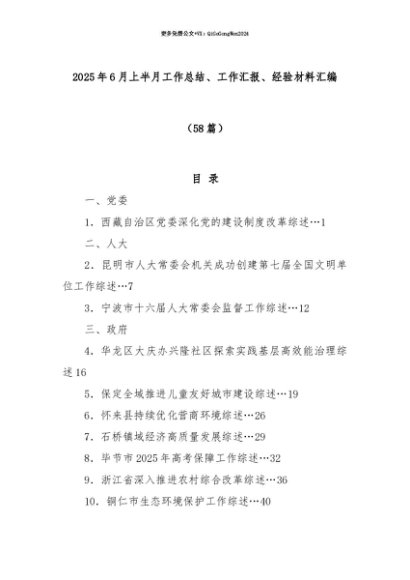 【七哥公文】2025年:【七哥公文】(58篇)2025年6月上半月工作总结、工作汇报、经验材料汇编+更多免费公文+VX:QiGeGongWen2024+更多免费公文+VX:QiGeGongWen2024