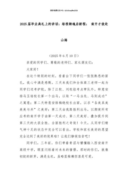 【七哥公文】2025年:【七哥公文】2025届毕业典礼上的讲话:培根铸魂启新程: 南开才俊赴山海+更多免费公文+VX:QiGeGongWen2024+更多免费公文+VX:QiGeGongWen2024