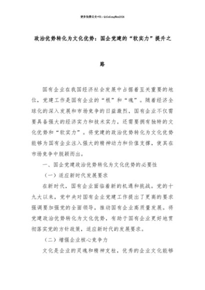 【七哥公文】2025年:【七哥公文】政治优势转化为文化优势:国企党建的“软实力”提升之路+更多免费公文+VX:QiGeGongWen2024+更多免费公文+VX:QiGeGongWen2024