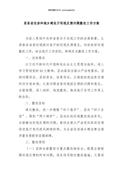 【七哥公文】2025年:【七哥公文】某某省住房和城乡建设厅巡视反馈问题整改工作方案+更多免费公文+VX:QiGeGongWen2024+更多免费公文+VX:QiGeGongWen2024