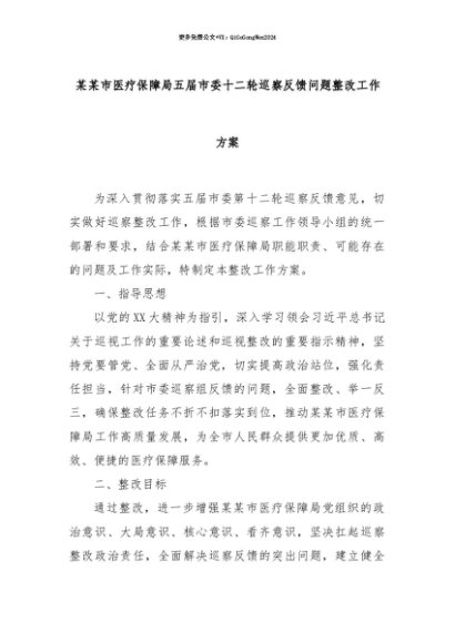 【七哥公文】2025年:【七哥公文】某某市医疗保障局五届市委十二轮巡察反馈问题整改工作方案+更多免费公文+VX:QiGeGongWen2024+更多免费公文+VX:QiGeGongWen2024