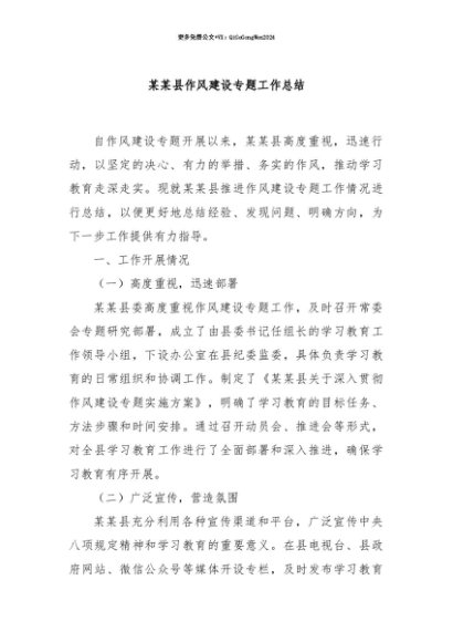 【七哥公文】2025年:【七哥公文】某某县作风建设专题工作总结+更多免费公文+VX:QiGeGongWen2024+更多免费公文+VX:QiGeGongWen2024