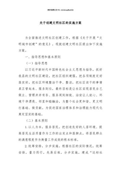 【七哥公文】2025年:【七哥公文】关于创建文明社区的实施方案+更多免费公文+VX:QiGeGongWen2024+更多免费公文+VX:QiGeGongWen2024
